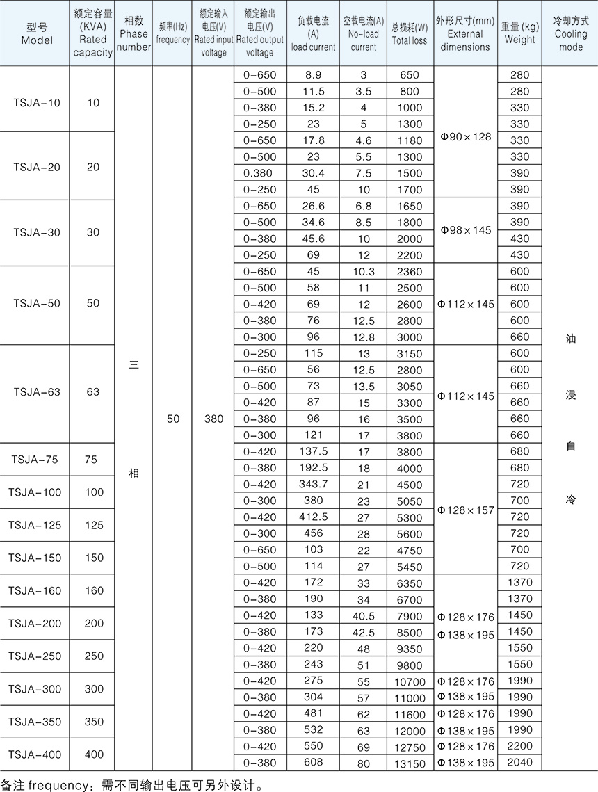 TDJA、TSJA系列單、三相油浸自冷感應(yīng)調(diào)壓器(穩(wěn)壓器)能在帶負(fù)荷情況下,無(wú)級(jí)、平滑、連續(xù)地調(diào)節(jié)輸出電壓。主要用于電機(jī)電器試 驗(yàn)、電爐控溫、整流設(shè)備配套、發(fā)電機(jī)勵(lì)磁等,在機(jī)械制造、化工、紡織、通訊、軍工等行業(yè) 得到廣泛應(yīng)用。 TDJA、TSJA型油浸式調(diào)壓器采用斜槽新工藝,波形好,達(dá)到IEC 標(biāo)準(zhǔn)對(duì)電器試驗(yàn)電源的 要求,該系列產(chǎn)品可平滑、無(wú)級(jí)地調(diào)節(jié)負(fù)載電壓,輸出電壓波形畸變小,壽命長(zhǎng)、運(yùn)行可靠, 使用、維護(hù)方便、損耗低、過(guò)載能力強(qiáng),具有兩種調(diào)壓速度,是電機(jī)、變壓器和其他電器 最 理想的可調(diào)電源。