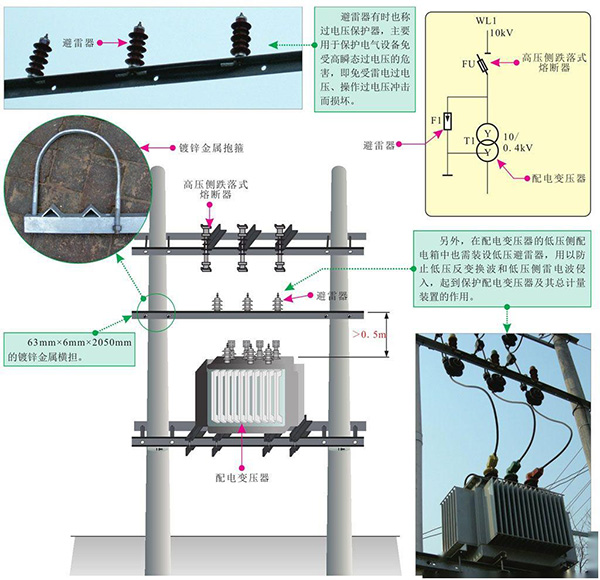 避雷器是配電變壓器中必不可少的防雷裝置,一般高壓側(cè)避雷器應(yīng)安裝在高壓熔斷器與變壓器之間,通常安裝在一根63mm×6mm×2050mm的鍍鋅金屬橫擔(dān)上。