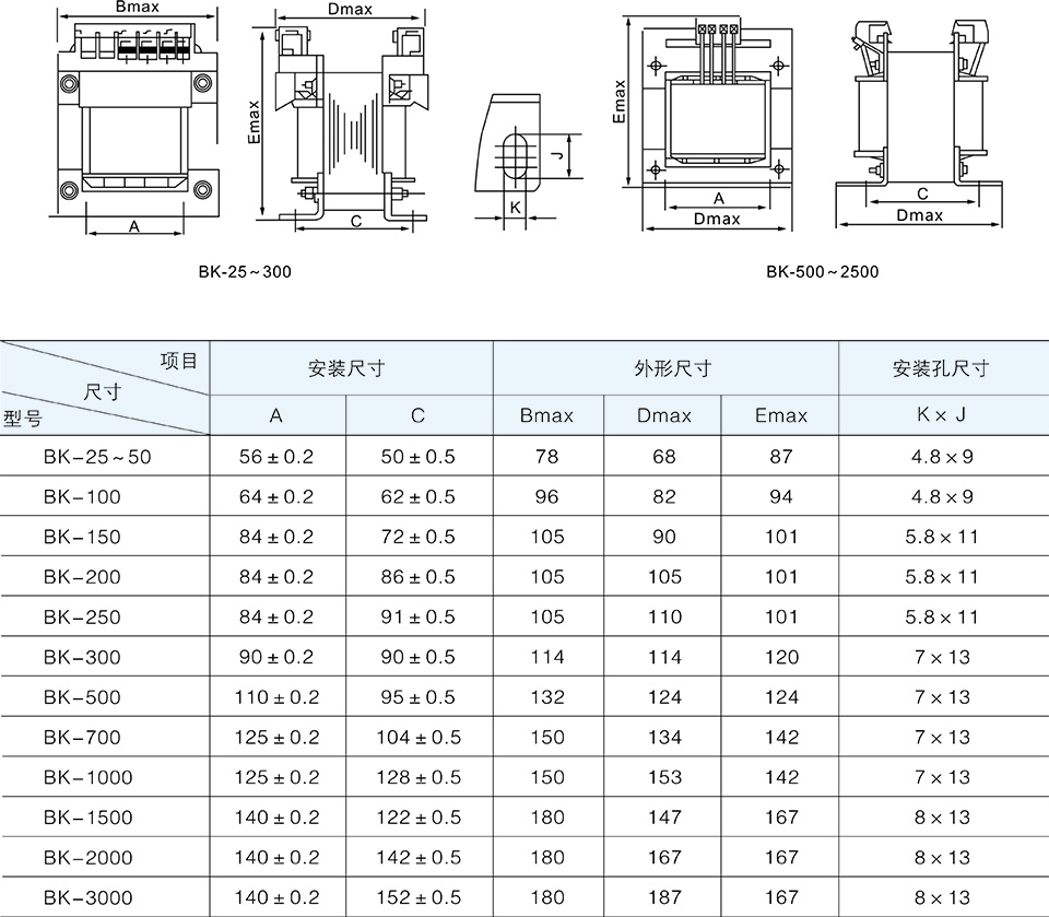 BK系列控制變壓器(以下簡(jiǎn)稱(chēng)變壓器)適用50-60Hz電壓至500V的電路中,通常用作控制電器或局部照明燈及指示燈的電源之用。BK變壓器結(jié)構(gòu)可分為殼式。按安裝方式可分為立式。 BK系列控制變壓器是經(jīng)過(guò)多年進(jìn)一步吸收國(guó)內(nèi)外同類(lèi)產(chǎn)品的優(yōu)點(diǎn),采用先進(jìn)工藝和嚴(yán)謹(jǐn)設(shè)計(jì)進(jìn)行制造,并優(yōu)選國(guó)外先進(jìn)方法的接線(xiàn)端子,具有性能優(yōu)良、工作可靠、耗能低、體積小、接線(xiàn)安全、防護(hù)等級(jí)高、適用性廣等特點(diǎn)。在額定負(fù)載下能長(zhǎng)期工作,是一種理想的變壓電源。